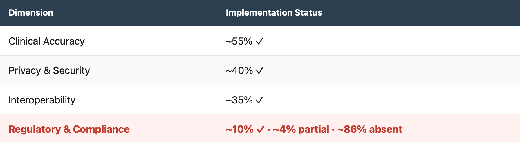 The research base makes the problem concrete: a 2026 IEEE Access taxonomy reviewed 49 published LLM-based healthcare agent systems (research papers documenting LLM-based agents in healthcare contexts) and found Regulatory & Compliance Constraints is the most underbuilt dimension — ~10% fully implemented, ~86% absent.