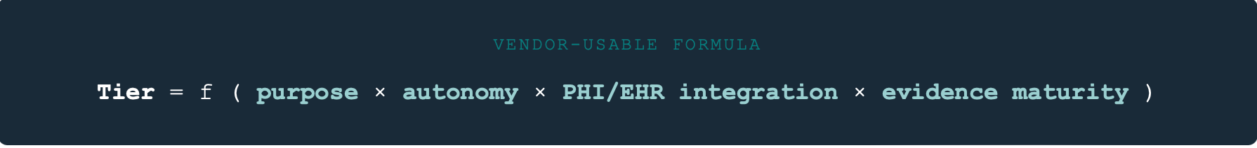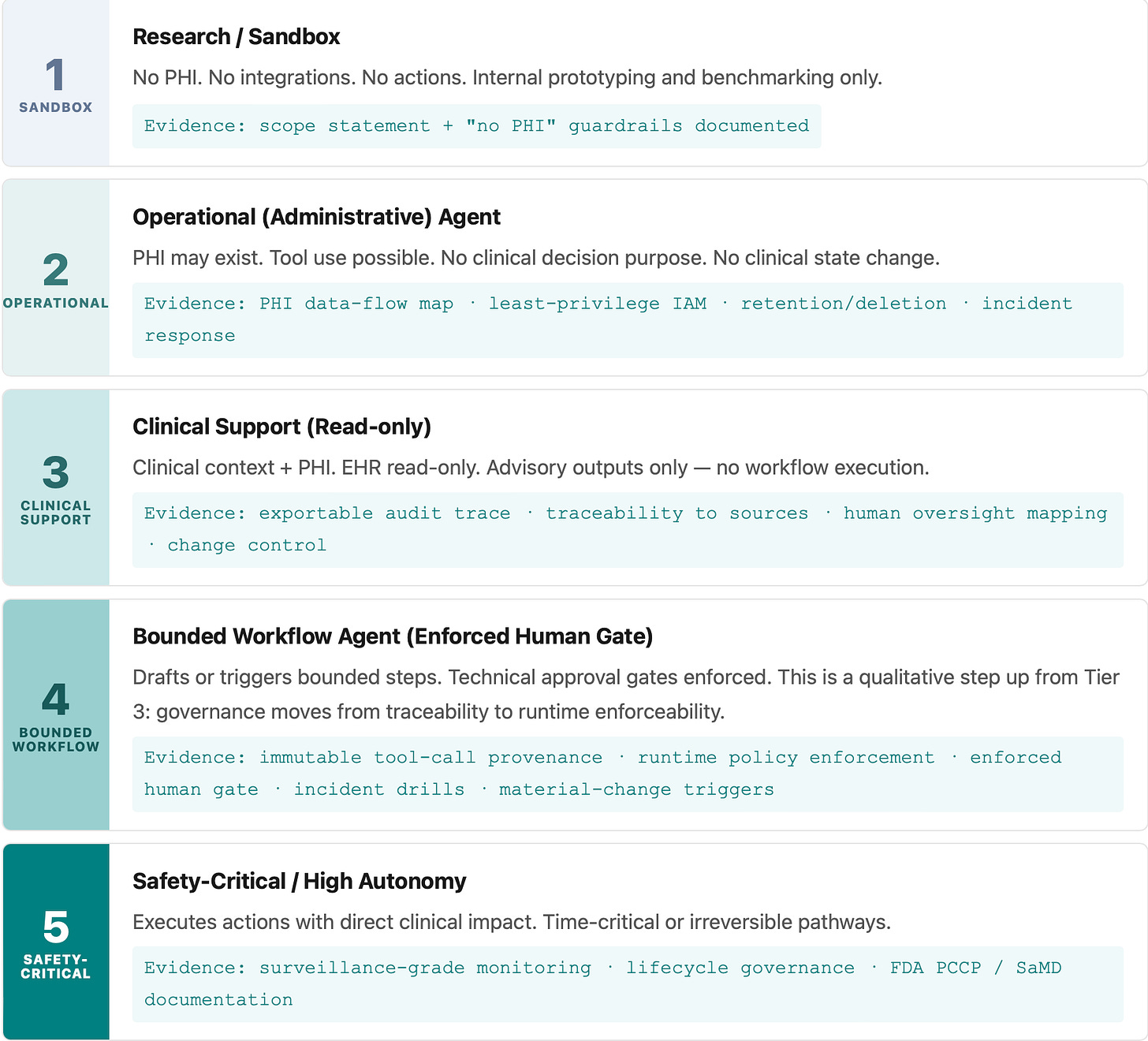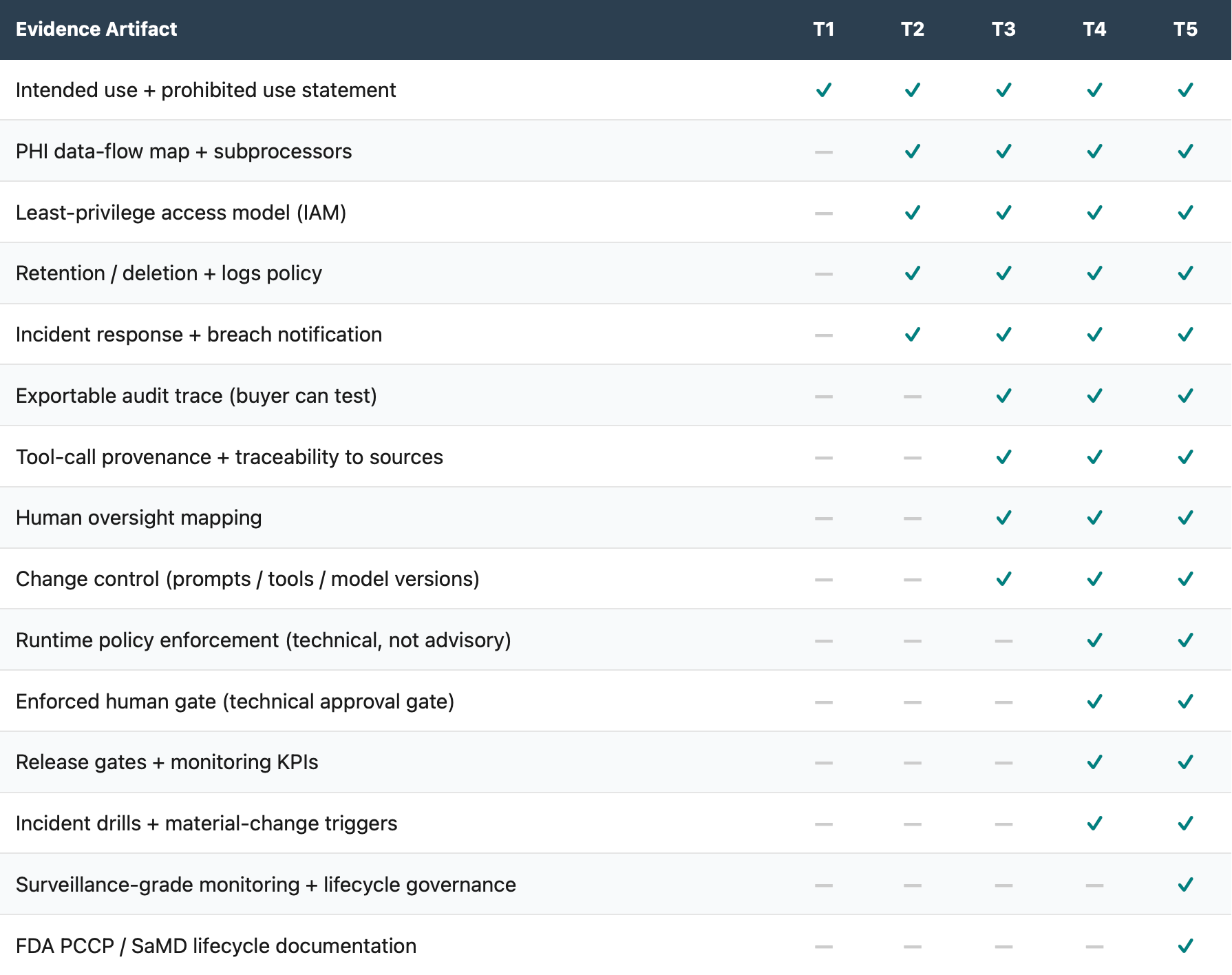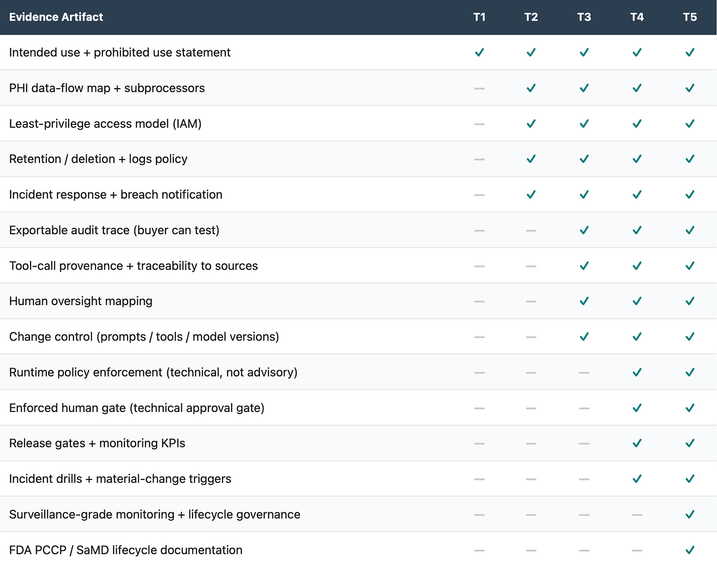 A Tier label (1–5) for your agent based on purpose, autonomy, and PHI/EHR scope — plus the evidence pack index procurement will check, and an EU AI Act risk overlay.