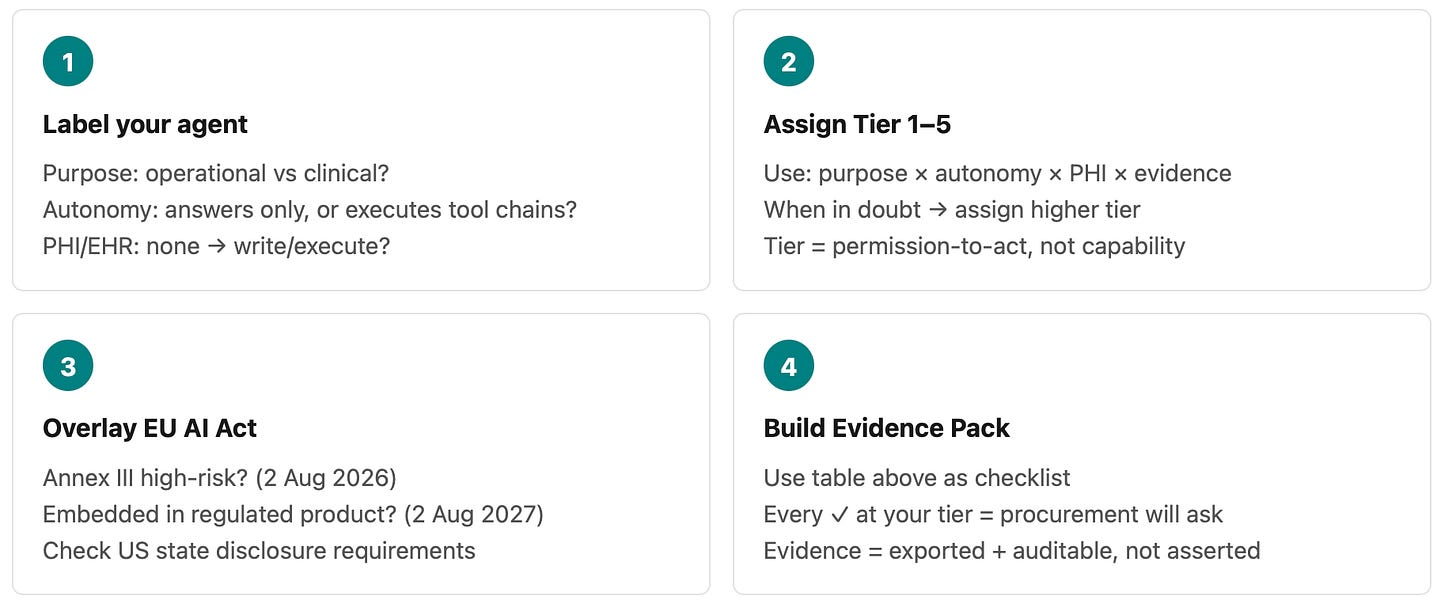 A deployment classification system for AI teams building or deploying healthcare AI agents — with the evidence pack enterprise procurement actually checks.